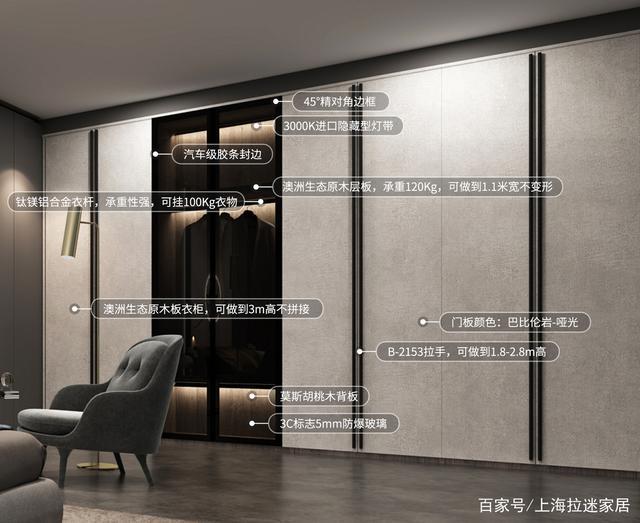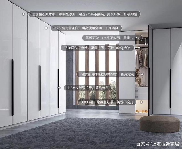 比如拉迷定制衣柜的標配是18MM柜體板,9MM背板,開門厚度為18MM,配拉迷阻尼鉸鏈和標價48元開門拉手,開門柜深度最多550MM(不含門),移門柜深度可以做650MM(含門),柜體顏色可選生態板陶瓷白,布拉格灰,巴比倫巖,多尼亞巖,原木黃,新胡桃木,白布紋。衣桿、抽屜、燈帶、自彈器或拉直器等五金,價格都是另外計算哦~