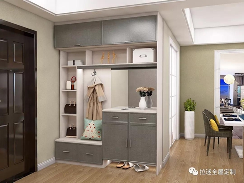玄關設計要義:玄關是家的第一道風景線,在玄關柜中設計一定程度的開放式空間來陳列盆景和工藝品,可以給空間營造更多的藝術氛圍。