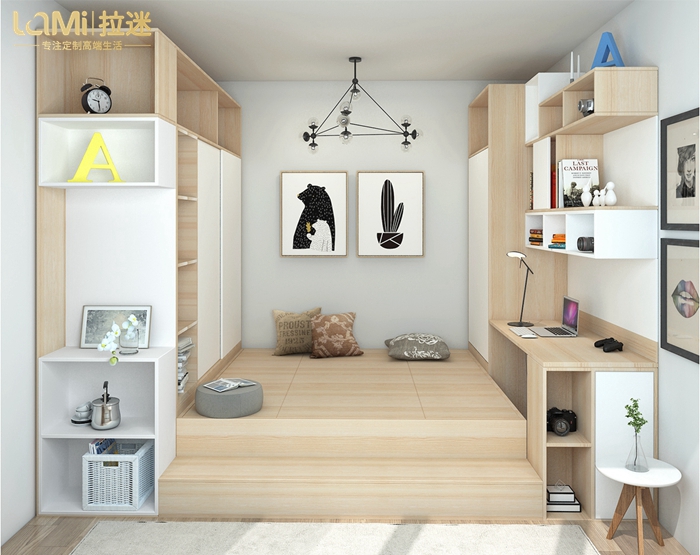 小戶型空間為了劃分各功能,會在不同區域鋪設不同材質與之呼應。其實這并沒有增加區域感,反而讓空間結構更加曲折,造成視覺上的阻礙和空間上浪費。其實應采用明度強,純度低的色系,地面色彩應略重于家具色彩,也可在地面鋪馬賽克或鵝卵石做導向,打破原本沉悶的視覺