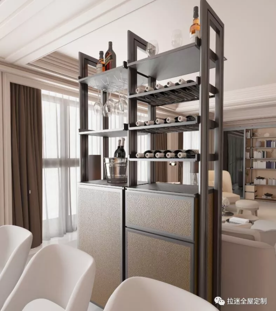 將餐廳與客廳空間用酒柜來隔斷,隔斷柜與餐邊柜合二為一,自然不造作;不僅具有功能性,還兼?zhèn)涿烙^性。