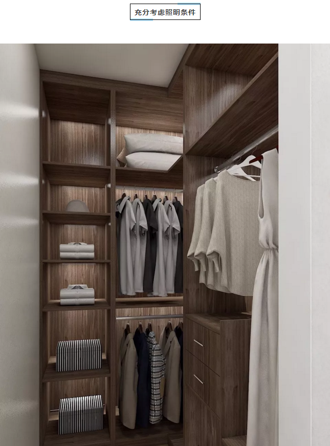 因為柜子里側的衣物難以看到,我們最好選擇色溫接近自然光的燈具,也可以使用暗藏式的衣柜感應燈,來避免集中式照明帶來的衣物色差問題。