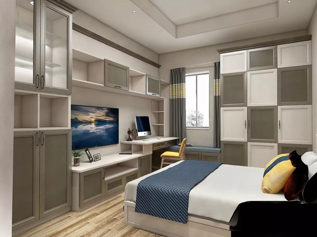 如果空間夠大,那就整體來一個包裹:將電視柜鑲嵌在衣柜中間。正對著臥床,這樣再不用擔心在炎炎夏天被曬黑了。躺在床上就能度過一個周末。