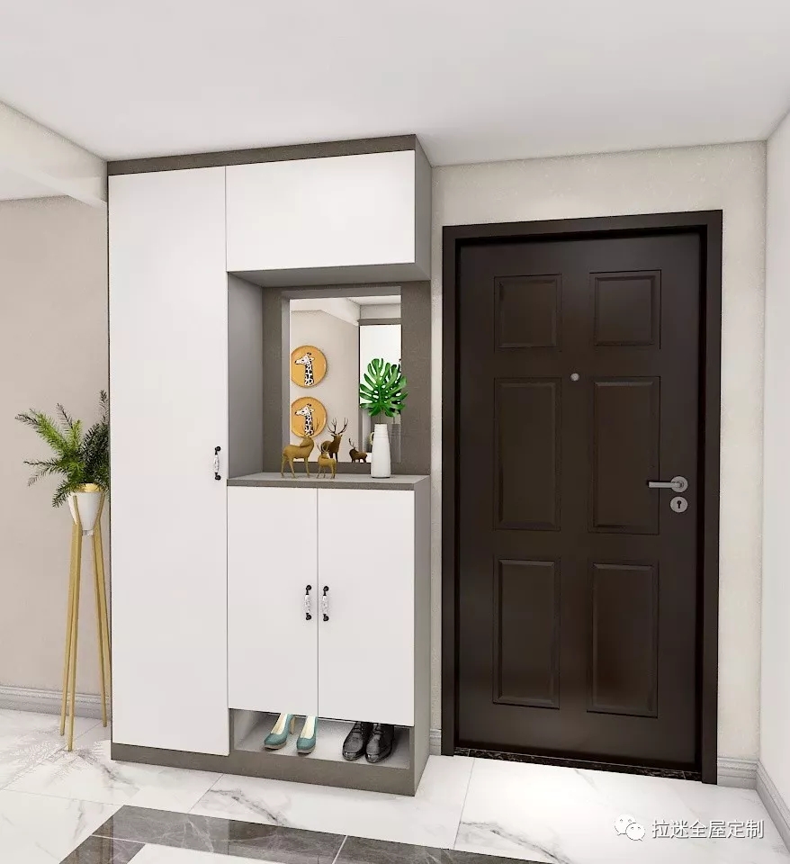 沒有玄關(guān)的情況下,可以放置一個(gè)隔斷功能的玄關(guān)柜,一方面化解了進(jìn)門看到廳的尷尬,也能解決鞋柜擺放的問題。