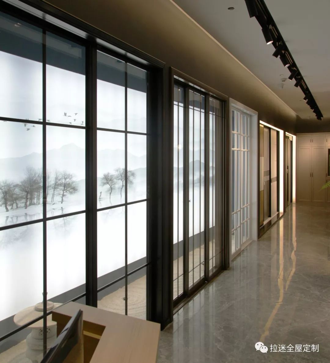 門店里不僅展示著各式各類的家具,也有拉迷主打的移門、隔斷門等產(chǎn)品。透過柔和的背景燈光,門框與玻璃相互交織的細(xì)節(jié)展露在眼前。