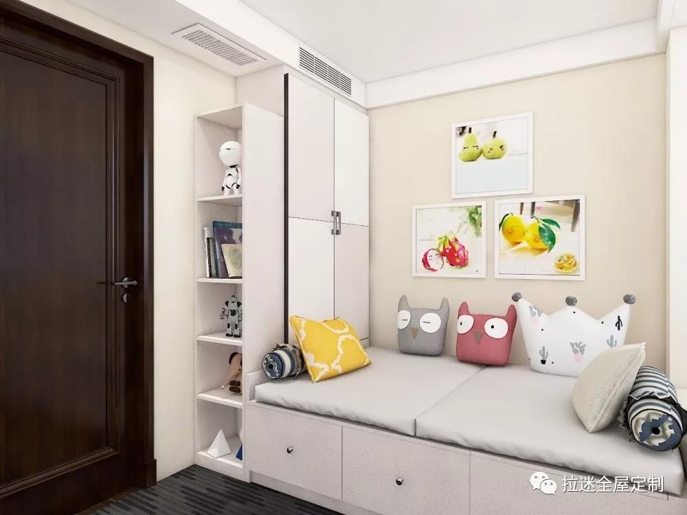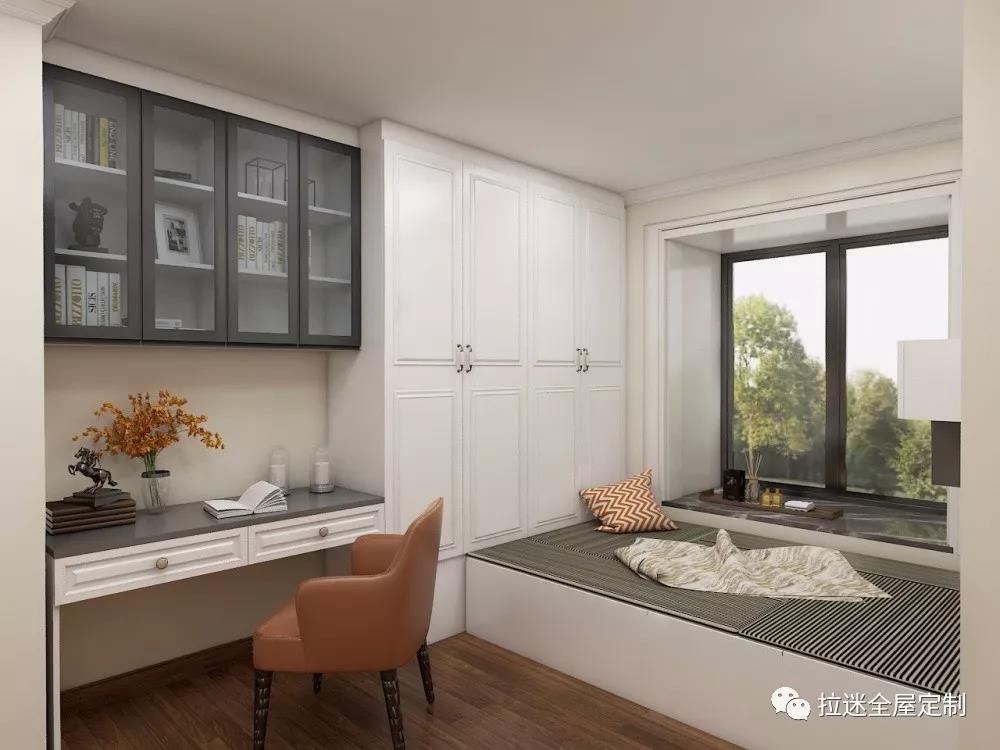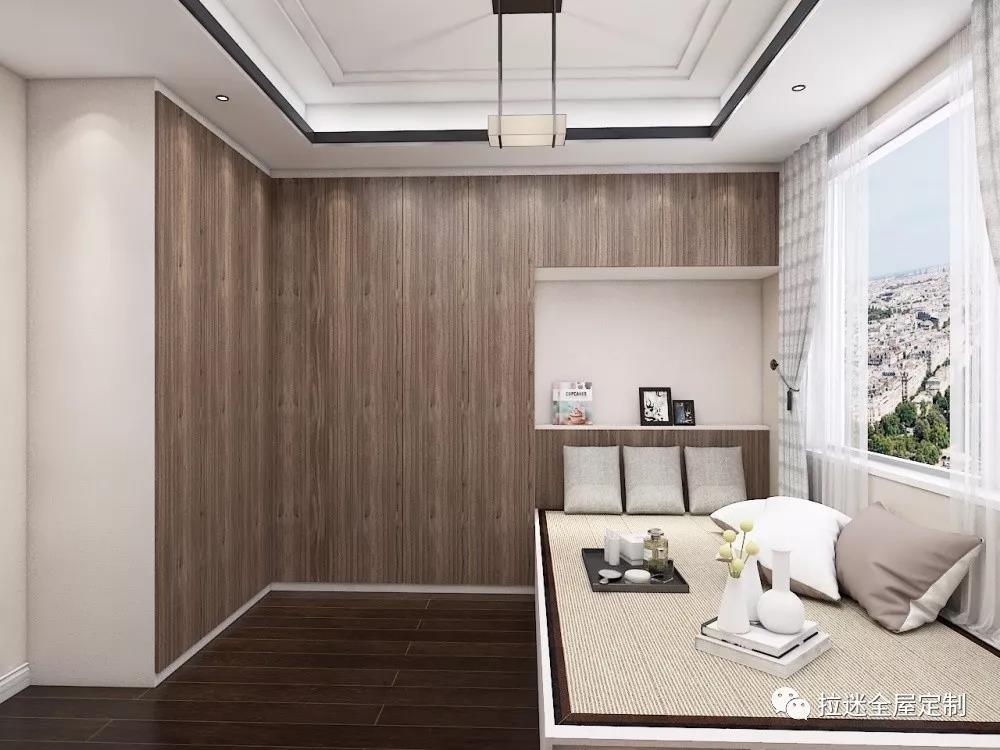 如果安裝榻榻米的這間臥室,主要功能是書房或者書比較多的話,可以在榻榻米床的周圍設計收納書柜,如果床的長度不夠,設計成吊柜也不錯。