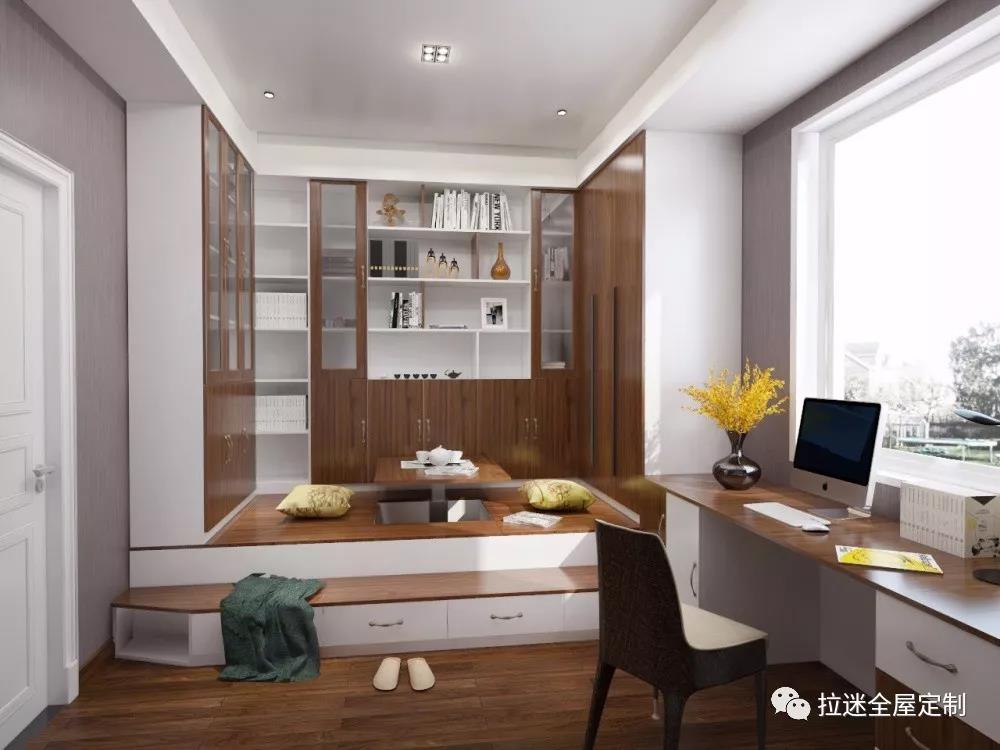 如果以半屋來布局榻榻米,那么榻榻米可以充當休閑區,用來休息和娛樂,而榻榻米之外則可作為工作區域,工作休息兩不誤,還能因勢利導,營造氛圍,打造出一個多功能房。