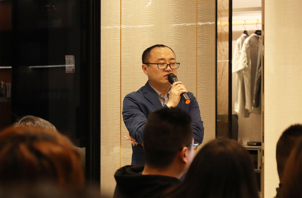 在享受完美食之后,大家聚集在展廳中心。由萬驪的營銷總監朱總為大家講解萬驪的產品工藝、以及設計靈感的來源。