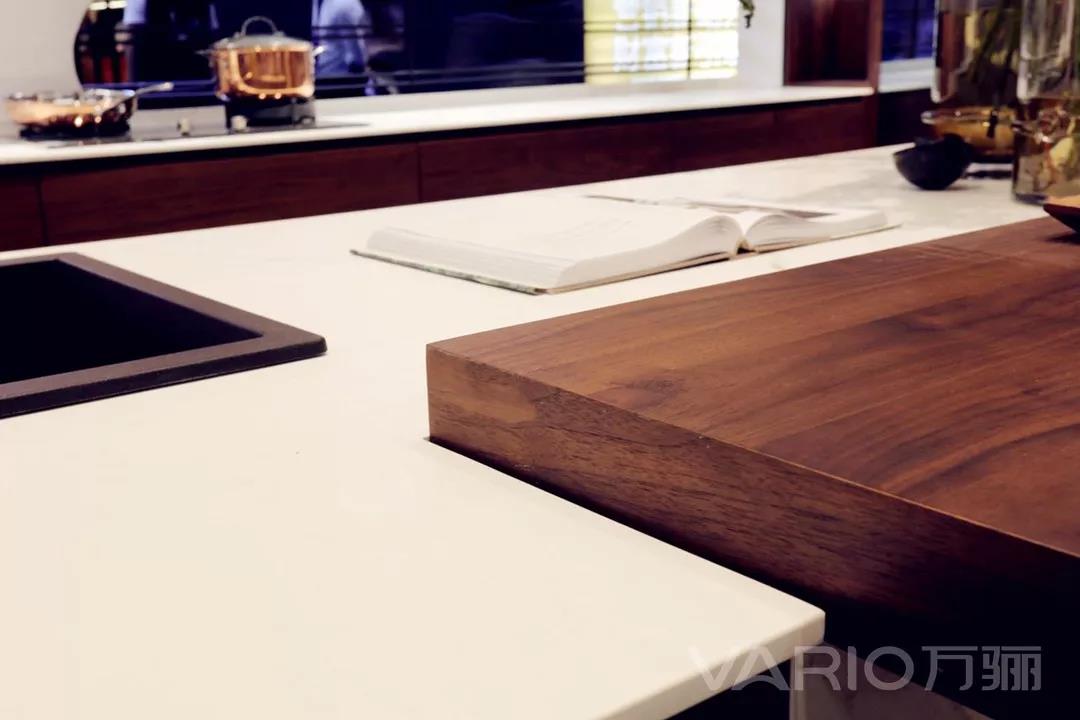 櫥柜島臺也選用了木板與巖板相結合的混搭風格,