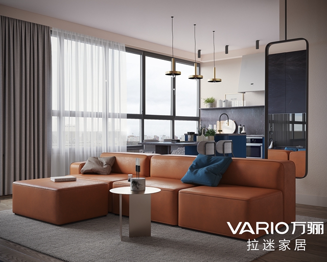 看起來光線明亮通透,沙發(fā)是愛馬仕橙的皮藝沙發(fā),搭配木質(zhì)地板,看起來清新又有格調(diào)。